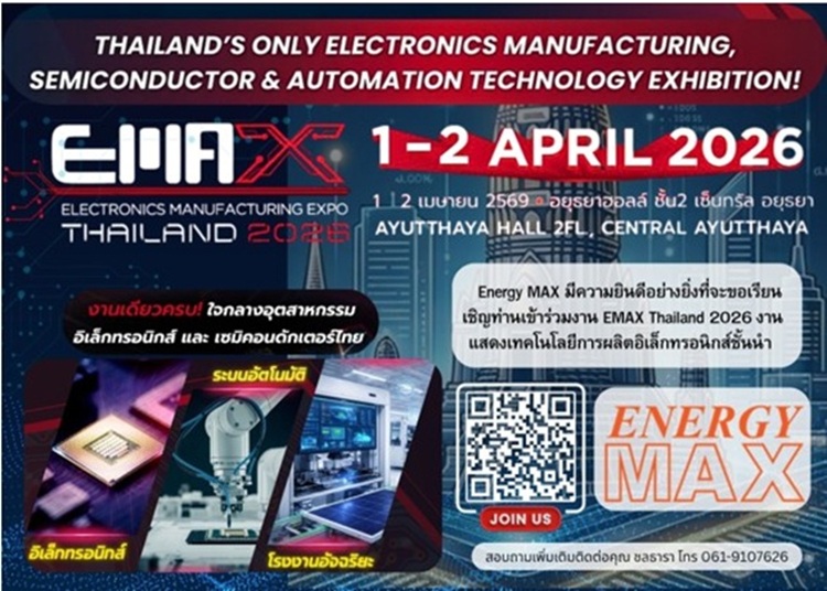 วันที่จัดงาน : 1 – 2 เมษายน 2569 เวลา : 10.00 – 17.00 น. สถานที่ : Ayutthaya Hall, ศูนย์การค้าเซ็นทรัล อยุธยา Electronics Manufacturing Expo (EMAX) Thailand 2026 งานแสดงเทคโนโลยีด้านการผลิตอิเล็กทรอนิกส์รวบรวมโซลูชันด้าน Electronics Manufacturing, Semiconductorและ Automation จากผู้แสดงสินค้าคุณภาพหลากหลายราย ครอบคลุมเทคโนโลยีสำหรับโรงงานยุคใหม่ ที่จัดขึ้นใจกลางพื้นที่อุตสาหกรรมสำคัญของประเทศไทย ภายในงาน EMAX Thailand 2026 รวมแบรนด์ผู้แสดงสินค้ากว่า 150 แบรนด์ระดับนานาชาติ และคาดว่าจะมีผู้เข้าชมงานในอุตสาหกรรมกว่า 4,000 ราย จึงนับเป็นเวทีสำคัญที่เปิดโอกาสให้คุณได้เชื่อมต่อกับผู้ผลิตและผู้ประกอบการที่ต้องการเข้าถึงกลุ่มอุตสาหกรรมอิเล็กทรอนิกส์ PCB เซมิคอนดักเตอร์ และชิ้นส่วนอิเล็กทรอนิกส์ ไฮไลต์ภายในงาน Electronics Manufacturing Expo (EMAX) Thailand 2026 สำหรับข้อมูลเพิ่มเติมเกี่ยวกับงาน […] ...